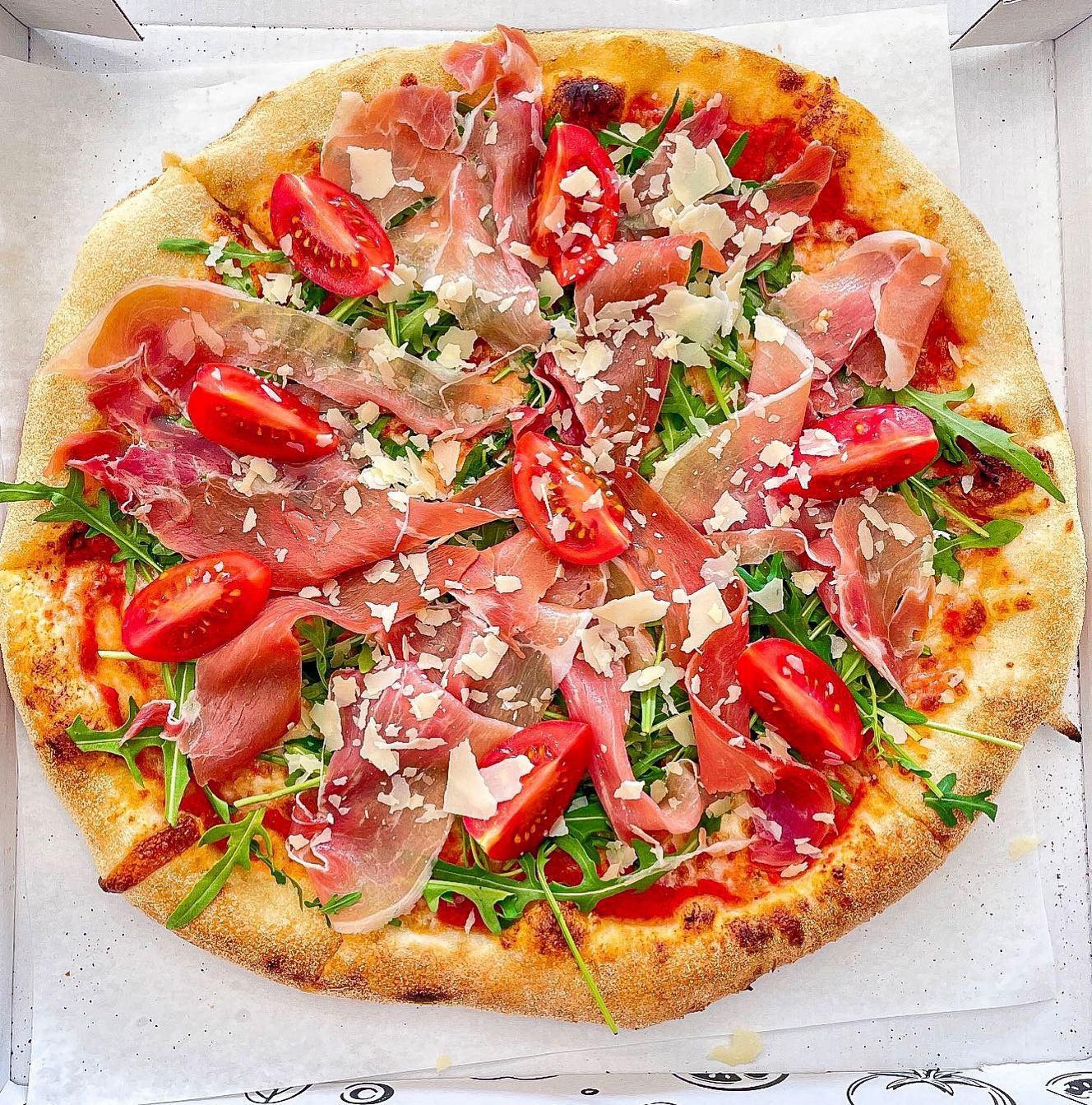 Blat, șos de roșii, mozzarella, prosciutto crudo, rucola, roșii